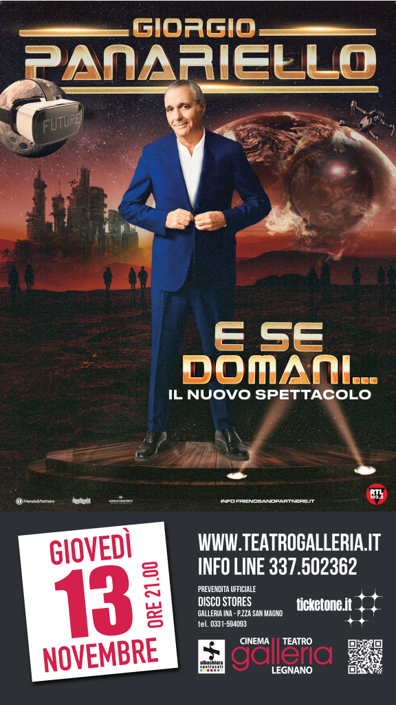 GIORGIO PANARIELLO con il nuovo show “E SE DOMANI…”, un racconto ironico e pungente del suo personalissimo “viaggio nel futuro”. Lo spettacolo inizia proprio con Panariello che viene ricatapultato al giorno d’oggi dopo essere stato scelto insieme ad altri personaggi (solo al pubblico in teatro svelerà chi sono) per andare a scoprire cosa ci riserva il futuro di cui tanto si parla.